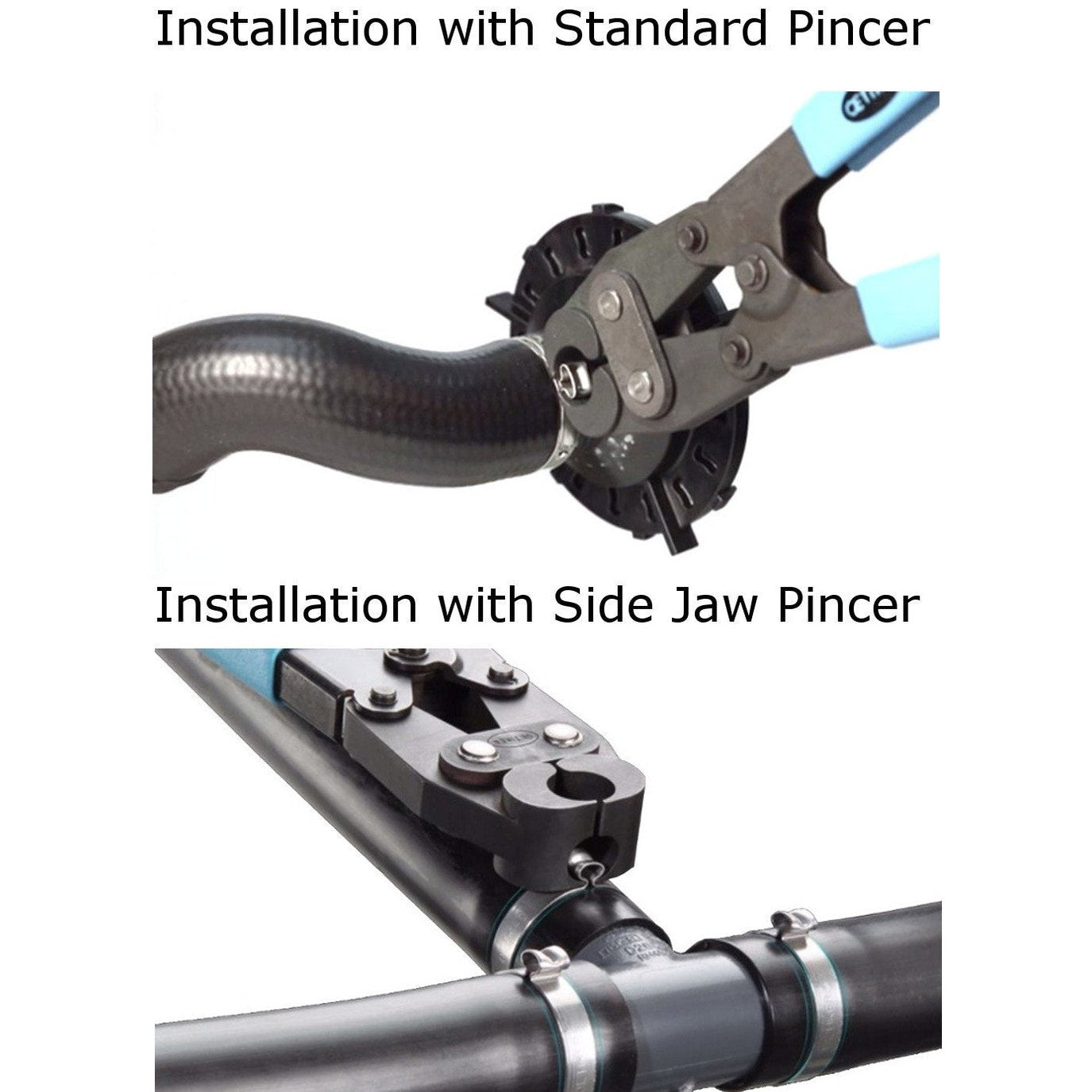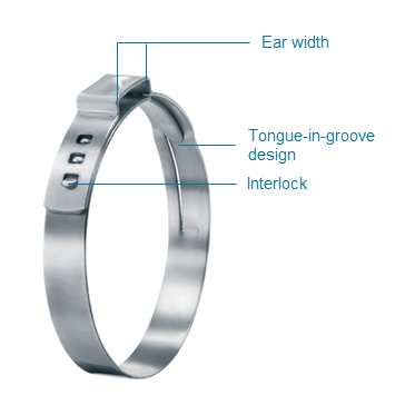 Clamping Procedure:After assembling the hose, use an Oetiker® ear clamping tool to compress the clamp’s first ear, followed by clamping the second. The clamp’s ears should be reduced in size by at least 40% to provide enough clamping force. If sized correctly, the clamp’s ears should not close completely during compression.