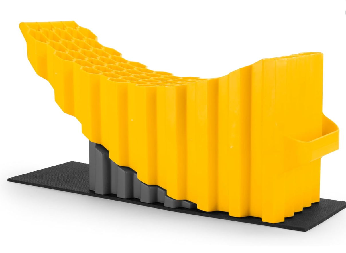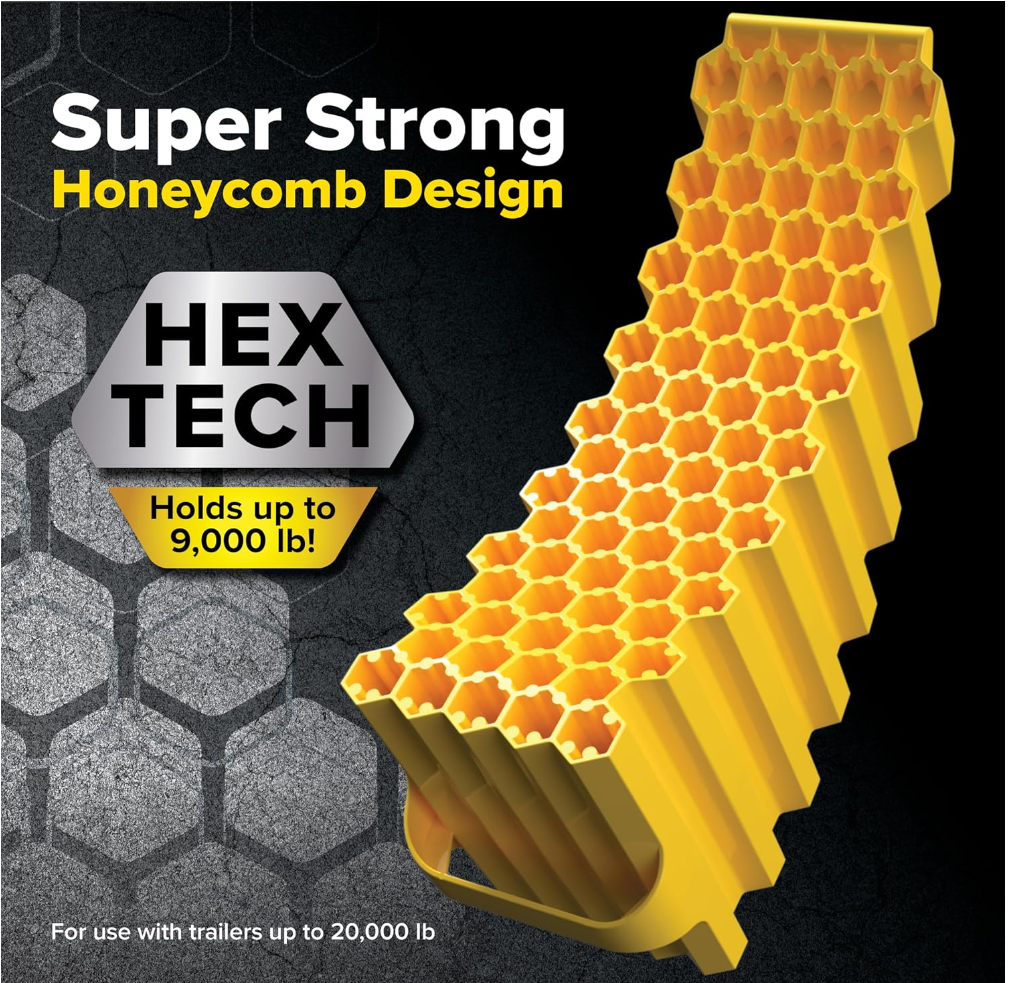 Built for trailers up to 20,000 lb and compatible with tires up to 32 inches in diameter, this ramp supports up to 9,000 lb. It features a durable, lightweight honeycomb construction and durable plastic with UV inhibitors for outdoor use. This kit includes a wheel chock and a rubber base pad to help improve traction and stability during use, plus an integrated carry handle for easier transport. Made in the USA.