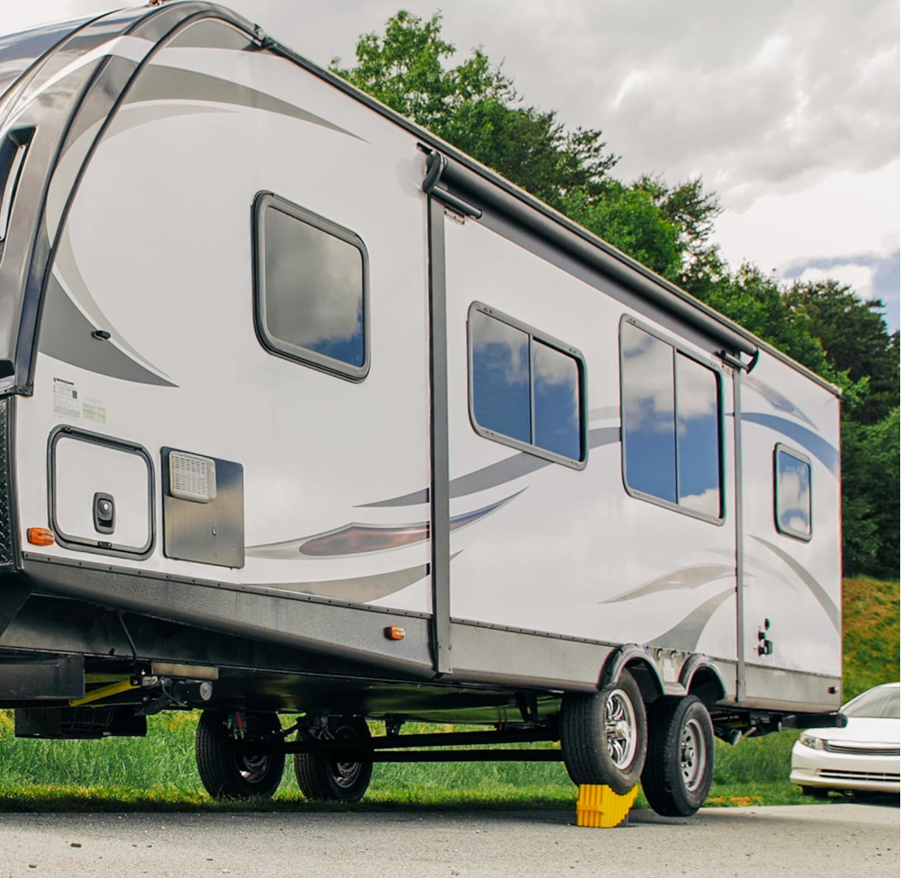 The Camco Curved Trailer-Aid is designed to simplify tire changes on tandem axle trailers by providing lift without using a jack. By driving the good tire onto the curved ramp, it raises the other tire up to 6.5 inches, creating clearance for service and roadside tire changes.