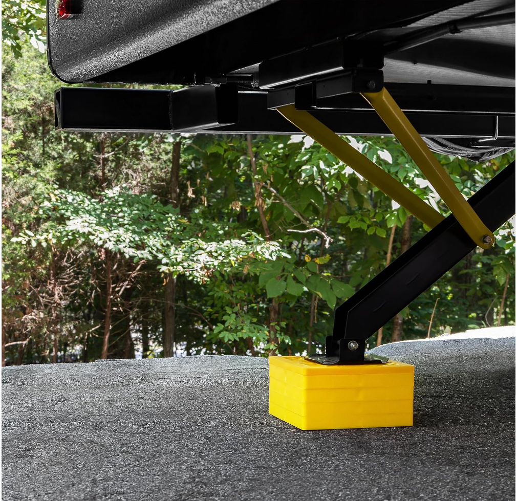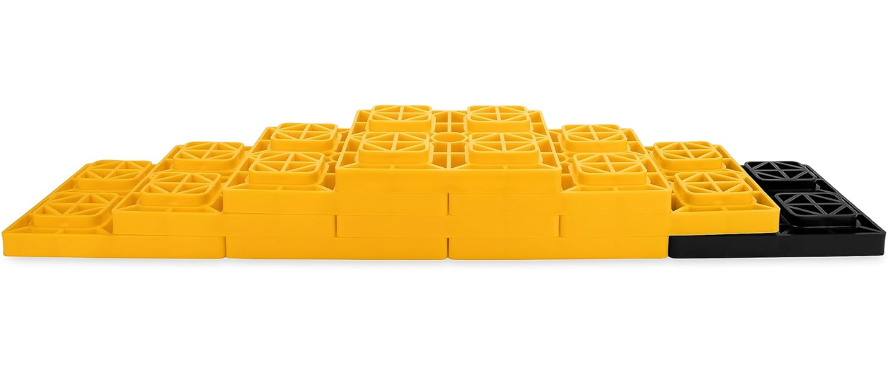 These blocks can be used with single wheels, double wheels, hydraulic jacks, tongue jacks, stabilizer jacks, 5th wheel jacks, or tandem axles. Made from UV-stabilized resin, they are built for outdoor exposure and long-term use. A built-in carrying handle pulls up for transport and twists down to secure the blocks together for compact storage.