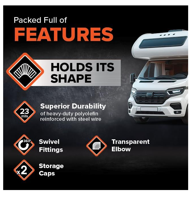 • Includes RhinoFLEX sewer hose, swivel bayonet adapter, 4-in-1 translucent elbow, and two storage caps