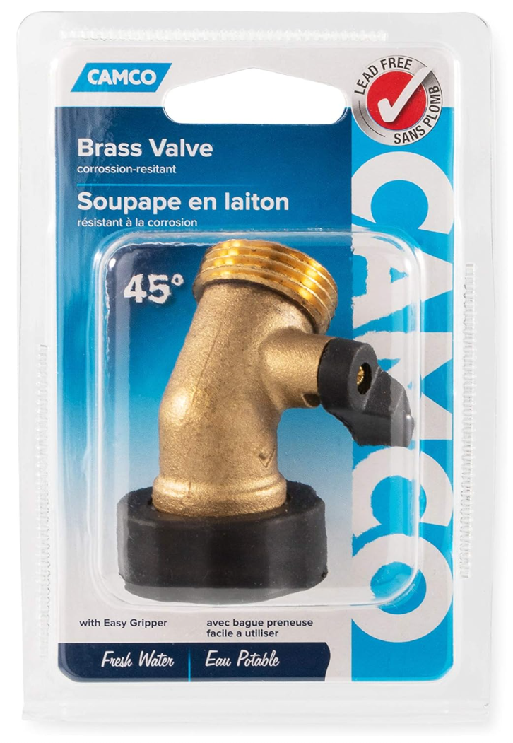 Description The Camco Solid Brass 45-Degree Drinking Water Valve is designed to reduce hose kinking and...