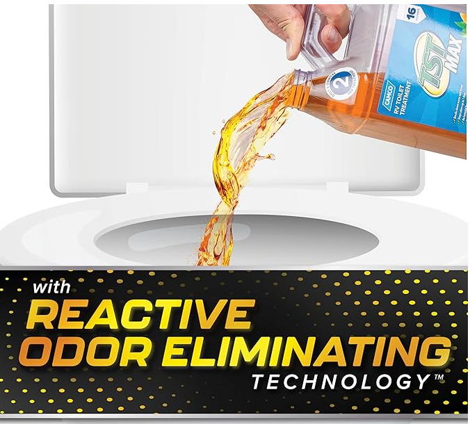 Camco TST MAX RV Toilet Treatment is a concentrated liquid formula designed to help control unwanted RV sewer odors and support the breakdown of waste and RV toilet paper in black water tanks. Using reactive odor-eliminating technology, it helps keep tanks smelling fresher for up to 7 days per treatment.