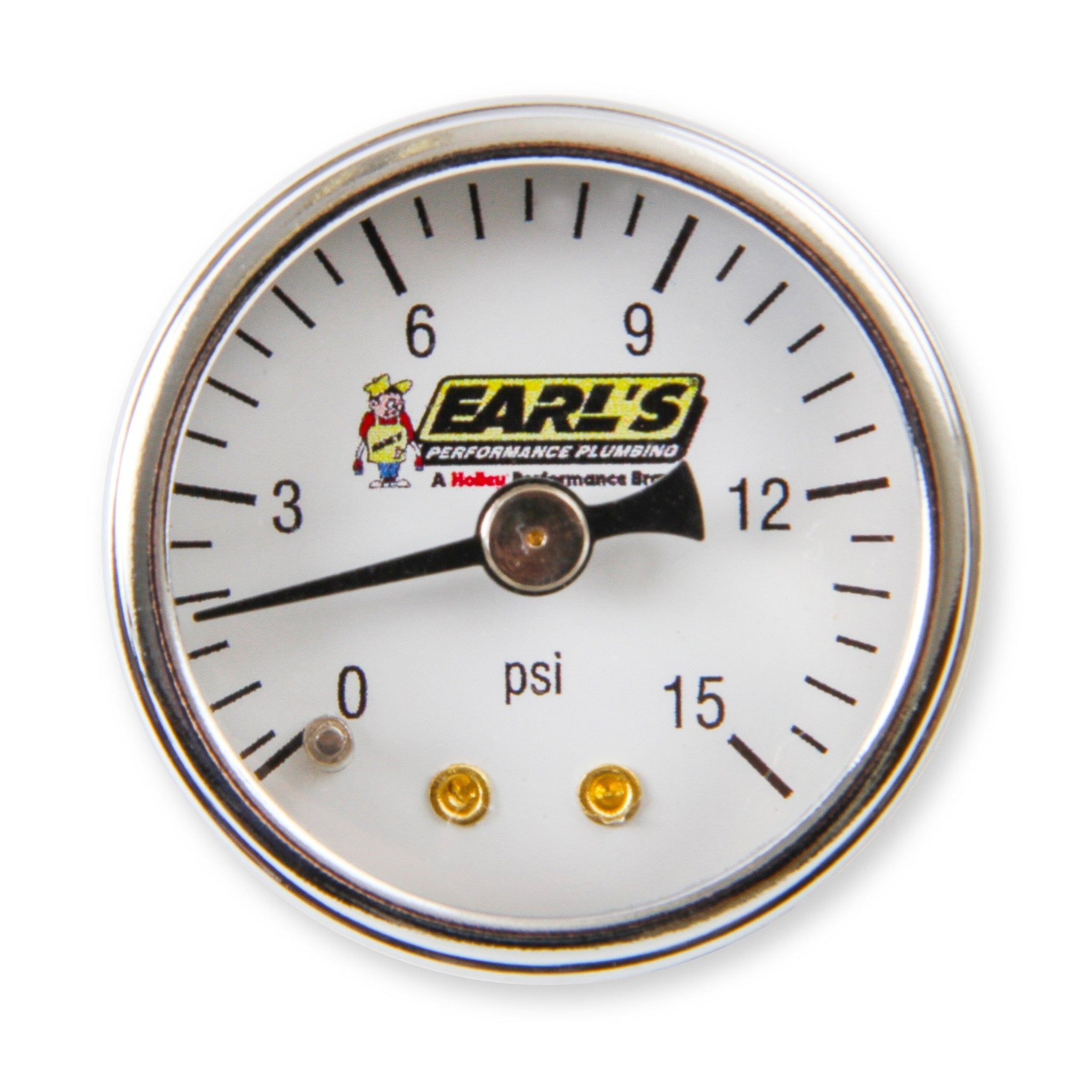 The Earl’s 0–15 PSI Analog Fuel Pressure Gauge provides a reliable and easy-to-read way to monitor your fuel system performance. Designed for precision and clarity, this compact 1.5-inch gauge features a clean white face with black lettering and a silver bezel for excellent visibility. Built for accuracy and durability, it connects via a 1/8" NPT male fitting, making it ideal for carbureted applications and low-pressure fuel systems. Perfect for performance engines or replacement installs, this gauge ensures real-time pressure monitoring to help maintain consistent fuel delivery.