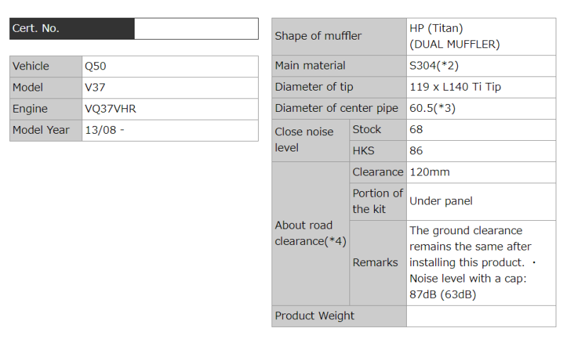 Enhance your Infiniti Q50 with the HKS Q50 VQ37 Dual Hi-Power Titanium Tip Catback Exhaust, designed for optimal performance and a bold sound. Crafted with precision, this exhaust system features dual titanium tips that not only improve exhaust flow but also add a sleek aesthetic touch to your vehicle's rear end. Constructed from high-quality materials, it ensures durability and resistance to heat and corrosion, making it suitable for daily driving and spirited performance alike. The system is engineered to meet regulatory requirements, with carb acknowledgment necessary for installation, ensuring compatibility with emissions standards where applicable. Installation is straightforward for those familiar with automotive modifications, and it offers significant improvements in exhaust tone and power output. Whether you're aiming to improve your vehicle's sound or enhance its performance, this HKS catback exhaust delivers reliable results without compromising daily usability.
