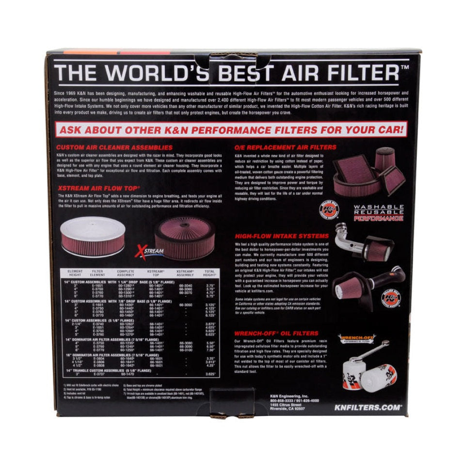 The K&N Engineering Flow Control Custom Assembly is designed to optimize airflow and enhance engine performance for 2-barrel Holley applications. This system features a specially engineered base combined with a unique lid designed to reduce intake turbulence, resulting in smoother, laminar airflow that improves cylinder filling. The enhanced airflow increases horsepower and torque, delivering noticeable performance gains for your vehicle. The assembly includes the renowned K&N Filtercharger element, known for its exceptional filtration efficiency and high airflow capacity, ensuring your engine remains protected while performing at its best. Constructed with durability and precision, this system is ideal for automotive enthusiasts seeking to maximize engine output without compromising filtration quality. It is lightweight and designed for easy installation, making it a practical upgrade for compatible vehicles seeking increased performance and reliable airflow management.