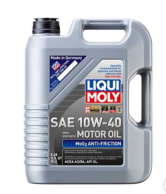 Semi-synthetic LIQUI MOLY specialty oil with an additive package containing Molybdenum Disulfide (MoS2). The unique formulation adds a high pressure and temperature resistant lubricating layer to all friction surfaces for added wear protection and safety reserves. Reduced friction will contribute to lower oil temperatures, oil consumption and stable oil pressure. Particularly suited for older generation air or water-cooled gasoline solid lifter engines, with or without turbochargers. The MoS2 formulation dictates the oils gray color.