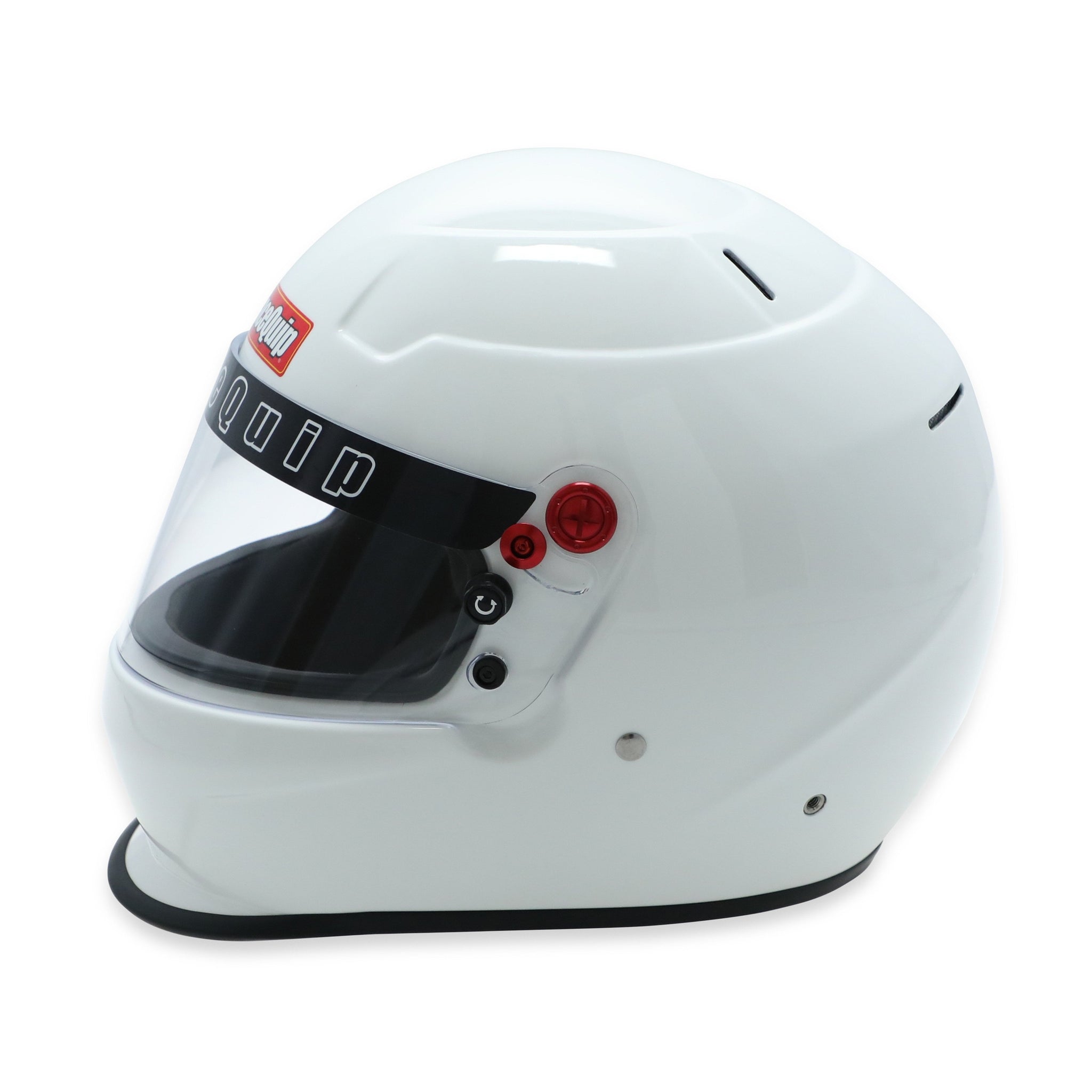 The RaceQuip PRO20 is a Snell SA2020 rated full face auto racing helmet that incorporates contemporary styling with modern production techniques. The shell is built using pre-preg composite materials placed into pressurized steel molds to achieve the best combination of light weight and strength. Reinforced M6 threaded HANS/HNR inserts are mated to the shell along with an expanded polystyrene (EPS) liner. HANS or other Head and Neck Restraint device anchor posts (not included) can be easily attached to the outside of the helmet using the installed M6 threaded inserts. The distortion free 3mm polycarbonate faceshield features a red anodized aluminum pivot kit, hand ratcheting TearOff posts, and a silicone eyeport gasket to seal out dust and dirt. A wide eyeport provides good peripheral vision and allows the use of personal eyewear. The Snell SA rating means that the interior, paint, and kevlar chin strap are all fire retardant so the RaceQuip PRO20 Helmet is suitable for use in all forms of motorsports. The comfort fit blended Nomex interior along with exhaust vents on the top and back of the shell help keep your scalp cool. All these features are wrapped in a stylish aero design FRP composite shell with a medium sized chin spoiler. NOTE: This helmet is Snell SA2020-certified and is broadly accepted by race organizing bodies and tracks through 2030. Always verify safety rules with your sanctioning body.