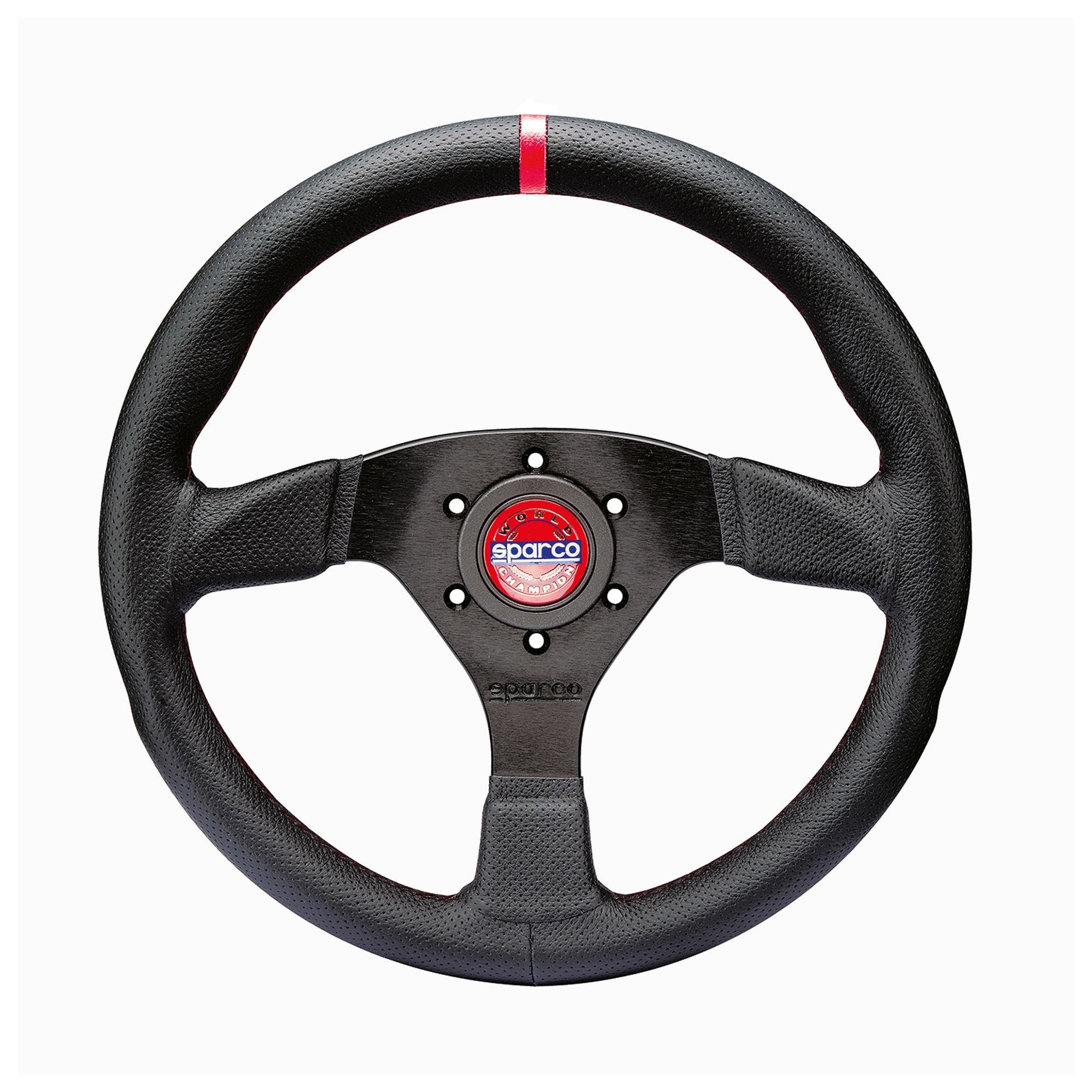 The Sparco R383 Champion Steering Wheel in black leather delivers a refined balance of performance and comfort. Crafted from high-quality leather with precision stitching, it offers a secure, ergonomic grip ideal for both spirited driving and daily use. The wheel’s racing-inspired shape enhances steering feedback and control, while its sleek, understated design integrates beautifully with modern interiors. Engineered to Sparco’s motorsport standards, the R383 Champion provides durability and professional-level responsiveness for discerning drivers.